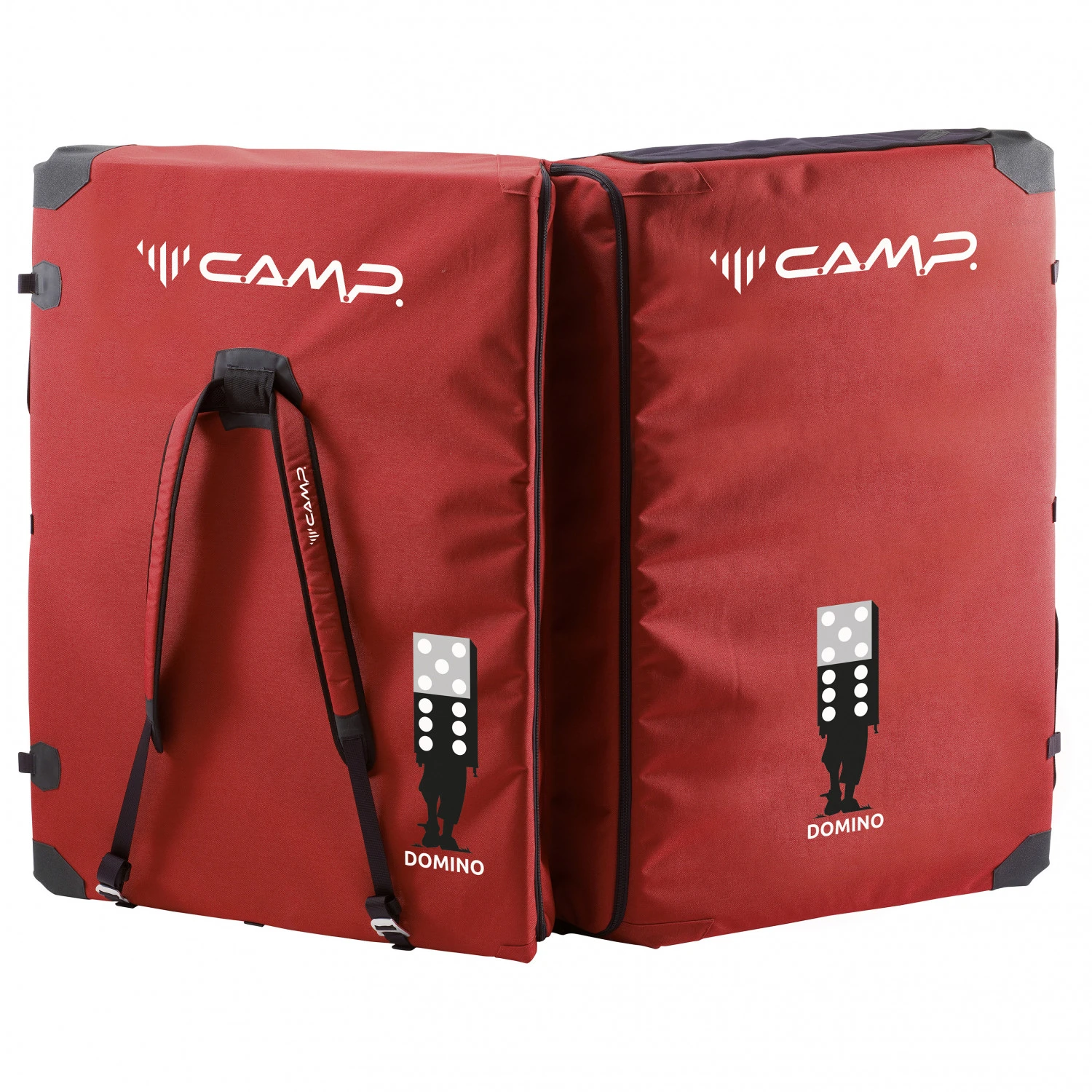 Das Domino Crashpad von C.A.M.P. besteht aus weichem, 13,5 cm dickem EVA-Schaum. Zur Verstärkung hat es an den Ecken Hypalon-Einsätze. Damit Du es gut zum Felsen und wieder zurücktransportieren kannst, ist es zusammenklappbar, mit Schnallen zu befestigen und dann mit Schultergurten zu tragen.